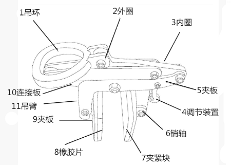 吊環(huán)-1、外圈-2、內(nèi)圈-3、調(diào)節(jié)裝置-4、夾板-5、銷軸-6、夾緊塊-7、橡膠片-8、第二夾緊板-9、連接板-10、吊臂-11。
